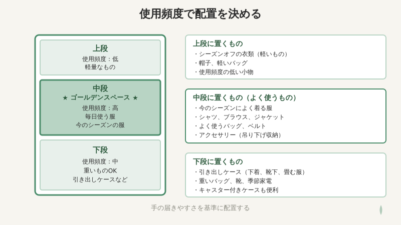 クローゼット収納で最も大切なのは、使用頻度に応じた配置です。クローゼットは上段・中段・下段の3つに分けて考えると、それぞれに適した収納が見えてきます。