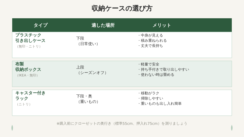 収納ケースを選ぶとき、デザインだけでなく、クローゼットの寸法や使い方に合わせることが大切です。