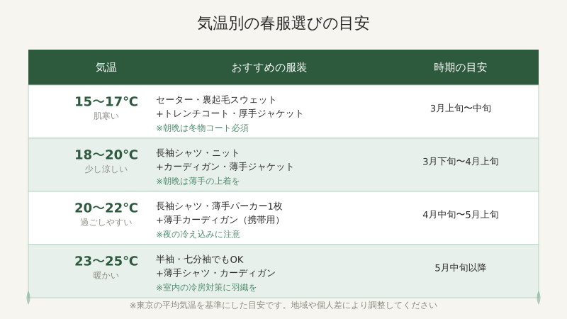 春は寒暖差が大きく、朝晩は冷え込むのに日中は汗ばむこともあります。何を基準に選べばいいのか分かりにくい季節です。