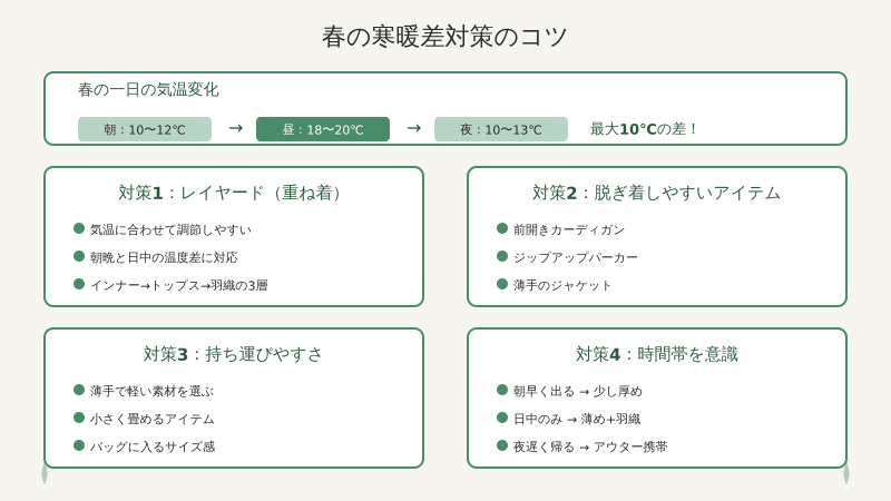 春は一日の気温差が大きいため、調節しやすい服装が重要です。