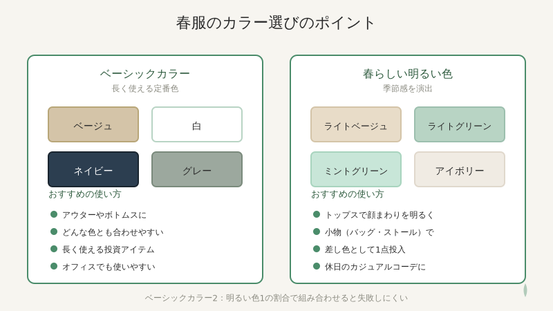 カラー選びは、自分の好みと普段のスタイルを優先して構いません。無理に明るい色を選ぶ必要はなく、ベーシックカラーだけでも十分春らしいコーディネートは作れます。
